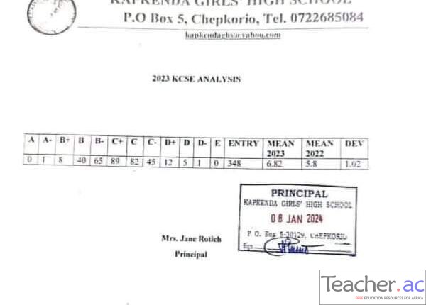 Kapkenda Girls High School KCSE 2023 Results Summary |