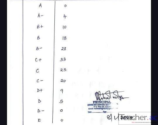 From the above 152 candidates, Lodwar Boys National School had 0 A (plain), 4 A- (minus), 10 B+, 18 B (plain), 18 B- (minus), 33 C+, 25 C (plain), 20 C- (minus), 9 D+, 5 D (plain), 0 D- (minus), and 0 E grades.