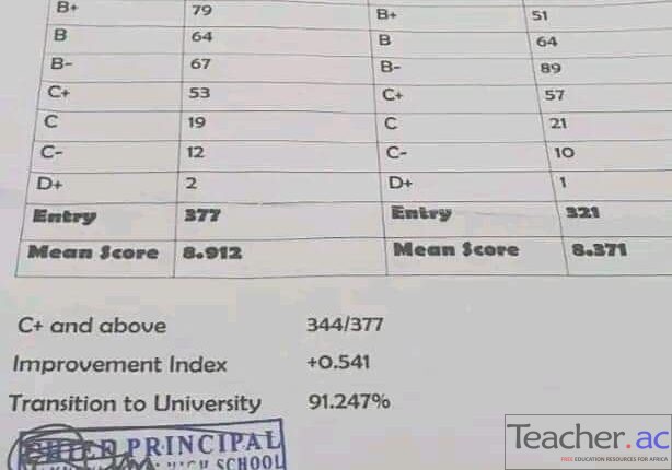 Out of the 377 candidates from the school who sat for the 2023 KCSE examinations, 344 of them managed the KUCCPS university direct entry of C+ (plus) and above.