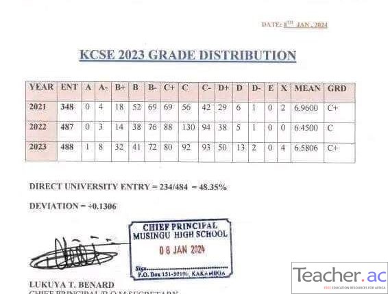 Musingu high School KCSE 2023 Results Grade Distribution Analysis