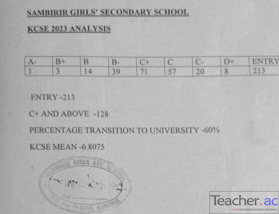 Sambirir Girls’ Secondary School KCSE 2023 Results Summary |