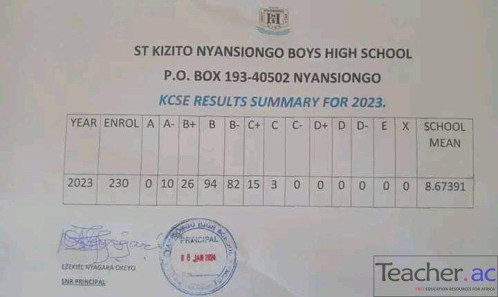 St. Kizito Nyansiongo Boys High School KCSE 2023 Results Summary |