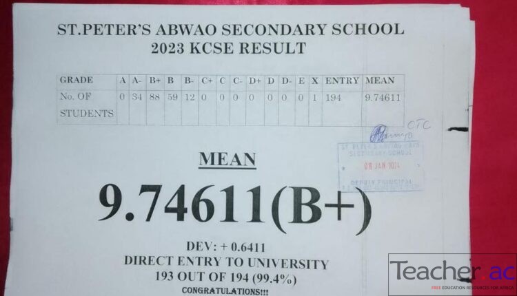 St. Peter’s Abwao Secondary School KCSE 2023 Results Summary |