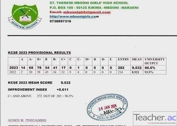 St Theresa Mbooni Girls High School KCSE 2023 Results Summary |